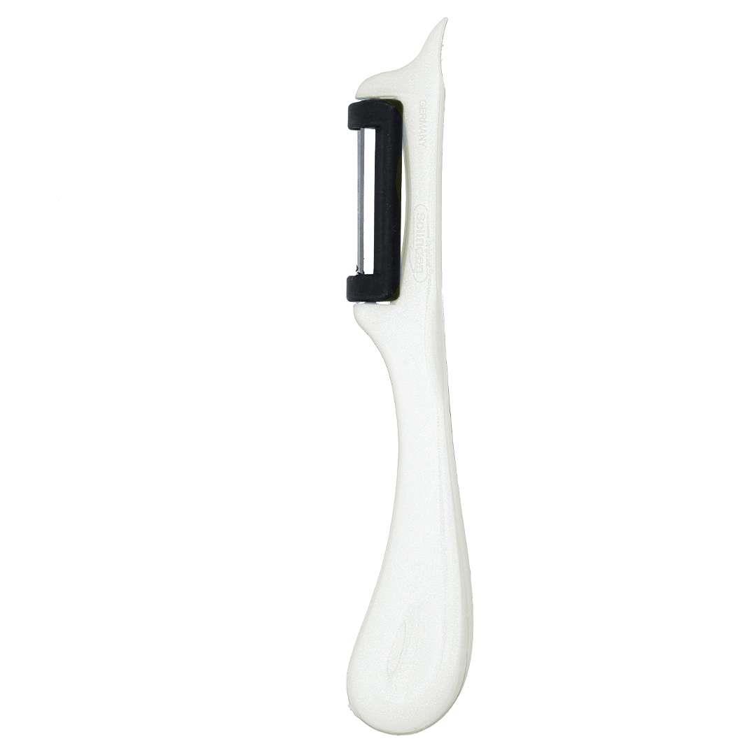 Alman Solingen ustalığıyla üretilmiş paslanmaz çelik dik soyacak, mutfakta hız, güven ve şıklığı bir arada sunar. Pırıltılı beyaz ergonomik sap tasarımı ve dik konumlu çift ağızlı bıçak yapısı sayesinde sebze ve meyveleri zahmetsizce, düzenli ve ince şekilde soyabilirsiniz.