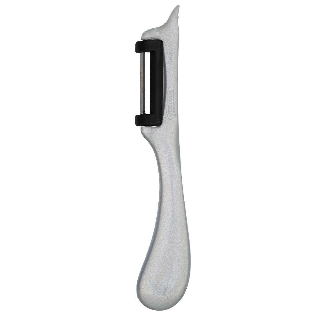 Alman Solingen ustalığıyla üretilmiş paslanmaz çelik dik soyacak, mutfakta hız, güven ve şıklığı bir arada sunar. Pırıltılı gümüş/gri ergonomik sap tasarımı ve dik konumlu çift ağızlı bıçak yapısı sayesinde sebze ve meyveleri zahmetsizce, düzenli ve ince şekilde soyabilirsiniz.