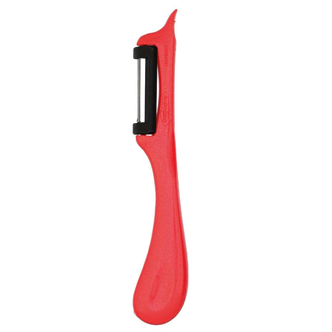 Alman Solingen ustalığıyla üretilmiş paslanmaz çelik dik soyacak, mutfakta hız, güven ve şıklığı bir arada sunar. Pırıltılı kırmızı ergonomik sap tasarımı ve dik konumlu çift ağızlı bıçak yapısı sayesinde sebze ve meyveleri zahmetsizce, düzenli ve ince şekilde soyabilirsiniz.